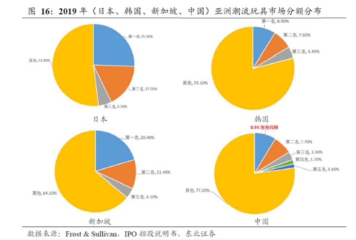 从市场竞争格局来看:日韩新潮玩市场前三玩家(基于零售价值)市场份额总占比均超过20%,尤其是日本和新加坡仅第一名市占率便超过20%。而相比于亚洲其他成熟国家市场,国内潮玩市场目前集中度仍然较低——2019年前五大市场参与者所占市场份额(基于零售价值)分别为8.5%、7.7%、3.3%、1.7%及1.6%,其中泡泡玛特市占率排名第一。