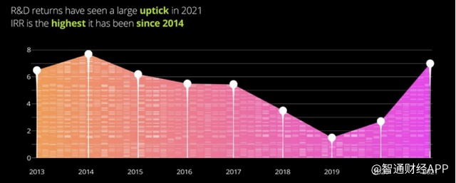 近年来,欧美大型医药企业的创新药研发成本持续攀升。据德勤估计,直到2019年,生物制药的创新研发回报率才从将近十年的下行趋势中开始逐渐恢复,在2021年收获了可喜的7%回报率。