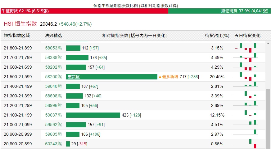 法兴恒指牛熊证街货分布图中的数据显示,熊证街货重货区在21500-21599区间,该区间最新熊证数量为717张,较上一交易日增加286张;最多新增在同一区间。