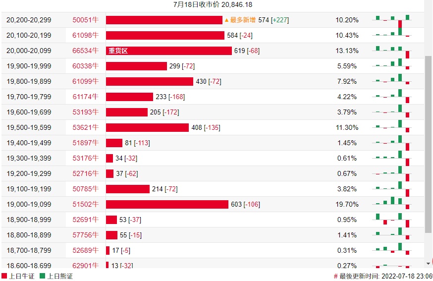 牛证街货重货区在20000-20099区间,该区间最新牛证数量为619张,较上一交易日减少68张;最多新增在20200-20299区间,该区间最新牛证数量为574张,较上一交易日增加227张。