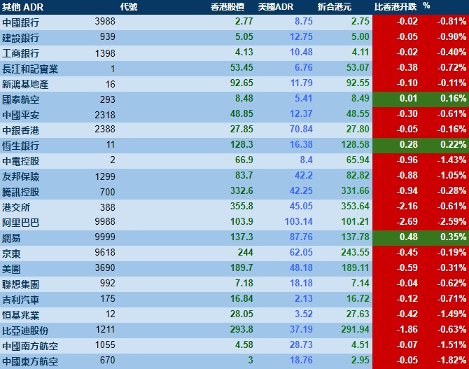 智通财经APP获悉,周一,美股三大指数集体收跌,港股ADR指数下跌,按比例计算,收报20665点,较香港收市跌180.72点或0.87%。