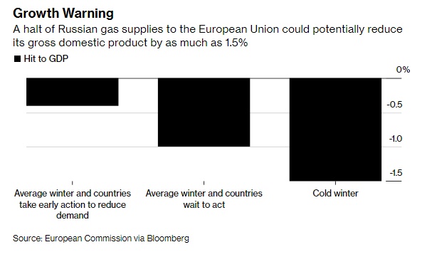 据媒体披露的欧盟文件草案显示,欧盟委员会警告称,如果今年遭遇严寒,并且欧洲未能储备足够的能源,一旦俄罗斯切断天然气供应,将使欧盟GDP最多减少1.5%。