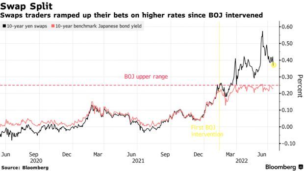 日本央行在6月份支出超过16万亿日元购买债券以帮助捍卫其0.25%的10年期国债收益率上限,这是有史以来最高的月度纪录。在去年11月澳大利亚在市场压力下放弃对收益率曲线的控制后,一些投资者相信黑田东彦最终也将屈服。澳洲国民银行外汇策略主管Ray Attrill表示,市场“决定测试日本央行的决心”。