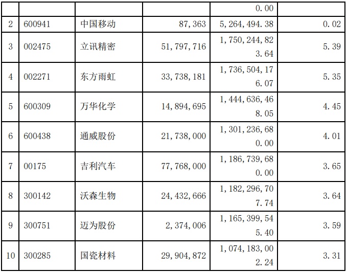 相较于一季度,先导智能(300450.SZ)、大族激光(002008.SZ)、卫宁健康(300523.SZ)退出前十大重仓股,迈为股份、吉利汽车、通威股份新晋前十大重仓股。