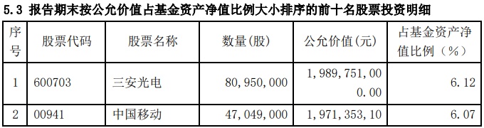 该基金前十大重仓股为三安光电(600703.SH)、中国移动(00941,600941.SH)、立讯精密(002475.SZ)、东方雨虹(002271.SZ)、万华化学(600309.SH)、通威股份(600438.SH)、吉利汽车(00175)、沃森生物(300142.SZ)、迈为股份(300751.SZ)、国瓷材料(300285.SZ)。