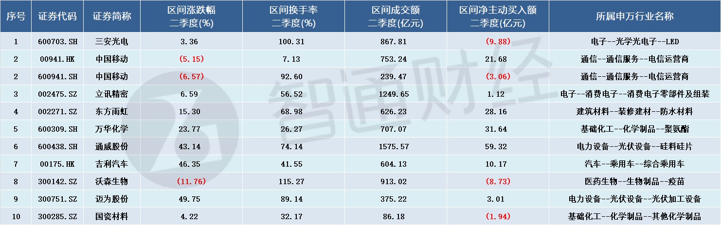 Wind数据显示,从股价表现来看,迈为股份在二季度阶段涨幅近50%,并在7月初突破了历史高点。通威股份、吉利汽车二季度涨幅均超40%。其中,通威股份二季度成交额达1575.57亿元,区间内净主动买入额达59.32亿元。