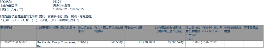 智通财经APP获悉,香港联交所最新资料显示,7月15日,The Capital Group Companies Inc.增持信达生物(01801)54.05万股,每股作价36.783港元,总金额约为1988.12万港元。增持后最新持股数目约为7370.06万股,最新持股比例为5.02%。