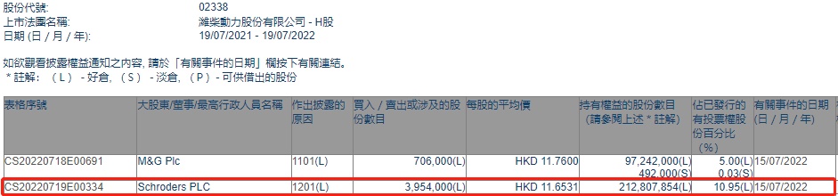智通财经APP获悉,香港联交所最新资料显示,7月15日,Schroders PLC减持潍柴动力(02338)395.4万股,每股作价11.6531港元,总金额约为4607.64万港元。减持后最新持股数目约为2.13亿股,最新持股比例为10.95%。