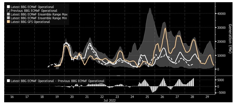 智通财经APP获悉,欧洲的风力发电量预计将于周二增加,这在一定程度上缓解了热浪席卷欧洲之际不断飙升的电价。根据媒体模型,德国周二的风力发电量预计将比周一的峰值增加一倍多,达到约1.8万兆瓦。但这仍远低于2月份创下的48663兆瓦的最高纪录。法国和英国预计也会有强风增加发电量。