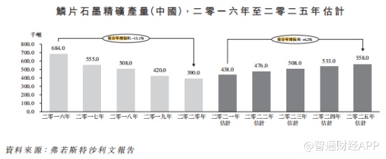 但在市场需求火热的同时,受到环境检测政策监管趋严、矿床开采成本增加等因素影响,中国石墨产量增速却远远不及销量增速。2016-2020年间,国内鳞片石墨精矿产量复合年增长率仅为-13.1%。