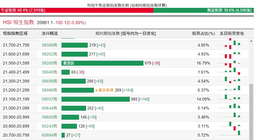 法兴恒指牛熊证街货分布图中的数据显示,熊证街货重货区在21500-21599区间,该区间最新熊证数量为679张,较上一交易日减少38张;最多新增在21200-21299区间,该区间最新熊证数量为269张,较上一交易日增加164张。
