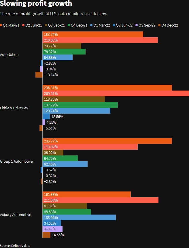 美国最大的零售商车之国将于周四公布业绩,预计该公司将公布自2020年以来最慢的季度利润增长。其他经销商,如Lithia Motors、Group 1 Automotive Inc 和阿斯伯里汽车集团也预计将在未来几周公布疲弱的业绩。