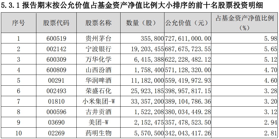 配置方面,该基金前十大重仓股分别为贵州茅台(600519.SH)、宁波银行(002142.SZ)、万华化学(600309.SH)、山西汾酒(600809.SH)、华润啤酒(00291)、荣盛石化(002493.SZ)、小米集团(01810)、古井贡酒(000596.SZ)、美团(03690)、药明生物(02269)。
