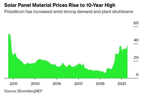 智通财经APP获悉,在世界各国政府推动清洁能源发展之际,由于工厂停产,多晶硅价格连续第八周上涨,这可能会减缓太阳能电池板的安装速度。
