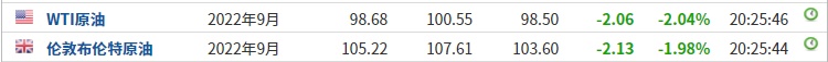 3. 截至发稿,WTI原油跌2.04%,报98.68美元/桶。布伦特原油跌1.98%,报105.22美元/桶。