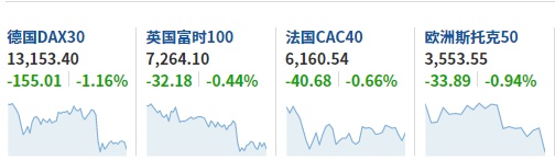 2. 截至发稿,德国DAX指数跌1.16%,英国富时100指数跌0.44%,法国CAC40指数跌0.66%,欧洲斯托克50指数跌0.94%。