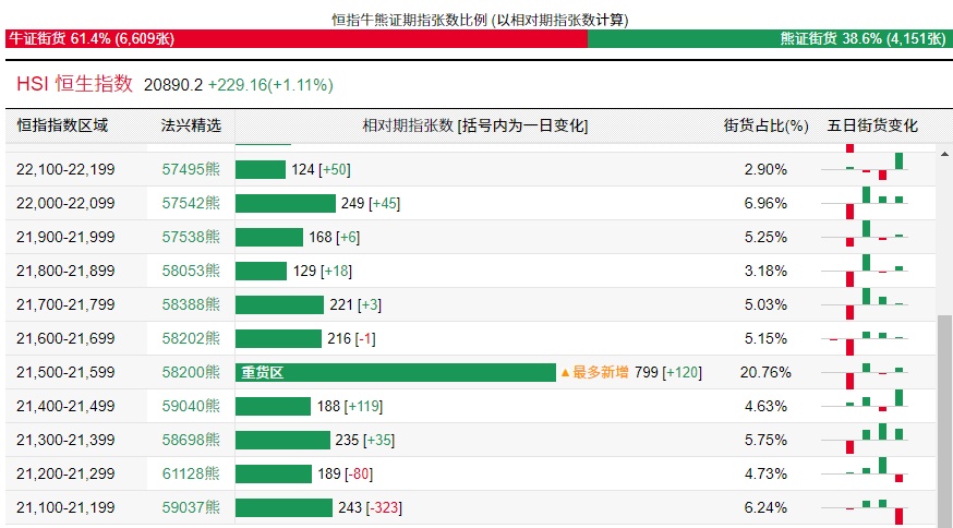 法兴恒指牛熊证街货分布图中的数据显示,熊证街货重货区在21500-21599区间,该区间最新熊证数量为799张,较上一交易日增加120张;最多新增在同一区间。