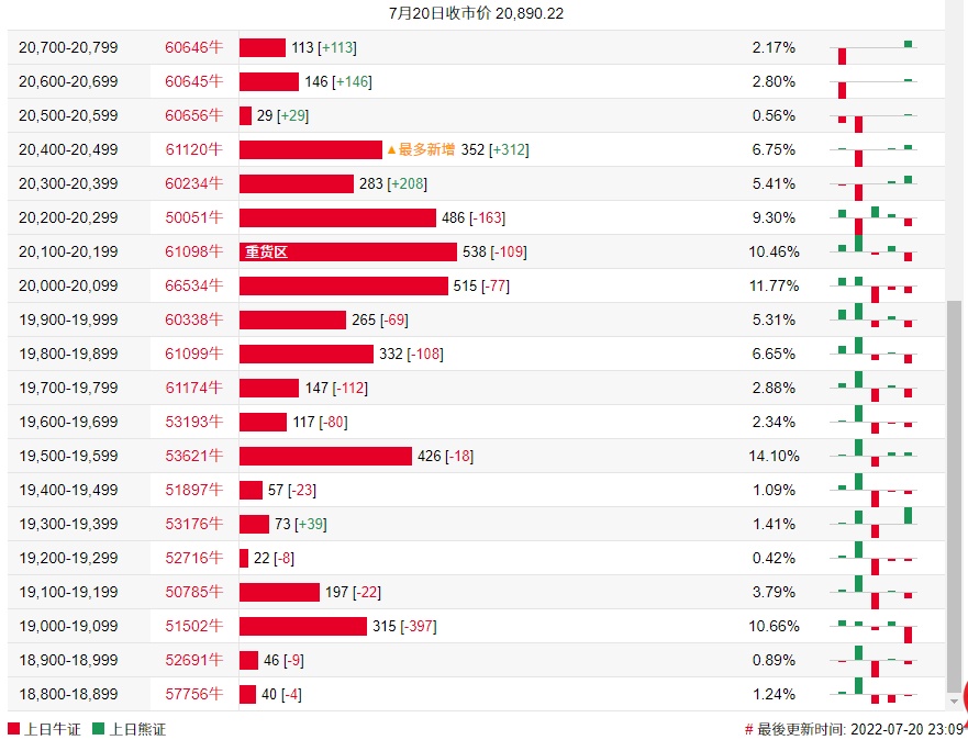 牛证街货重货区在20100-20199区间,该区间最新牛证数量为538张,较上一交易日减少109张;最多新增在20400-20499区间,该区间最新牛证数量为352张,较上一交易日增加312张。