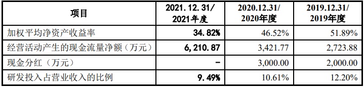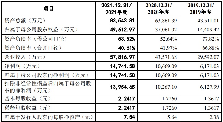 于2019年、2020年及2021年度,公司营业收入分别约为2.959亿元、4.357亿元及5.782亿元,复合增长率为39.78%,同期,净利润分别约为6171.03万元、1.067亿元及1.474亿元。