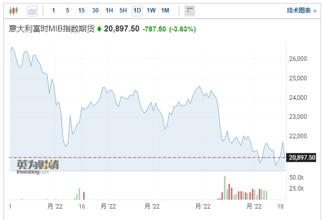 意大利股票和债券期货因德拉吉政府可能垮台出现下跌。意大利富时MIB指数期货合约下跌4%,而债券期货触及三周低点,欧元兑美元也下滑。截至发稿,意大利富时MIB指数期货下跌3.63%,报20897.5。