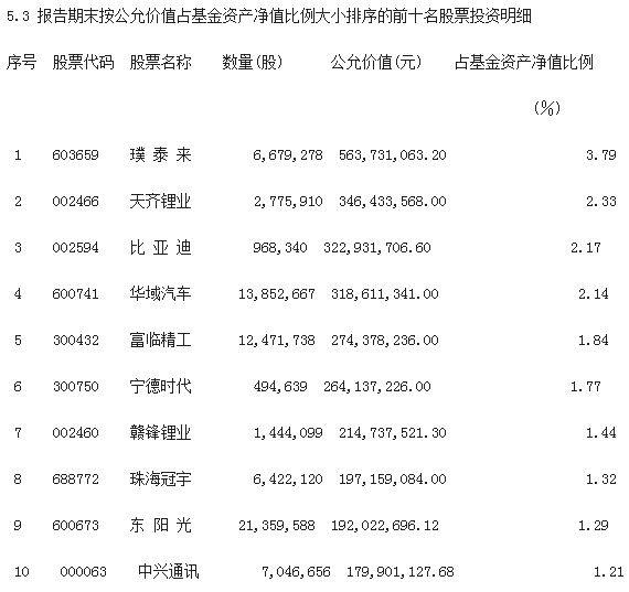 二季度,该基金前十大中房股份别为璞泰来(603659.SH)、天齐锂业(002466.SZ)、比亚迪(002594.SZ)、华域汽车(600741.SH)、富临精工(300432.SZ)、宁德时代(300750.SZ)、赣锋锂业(002460.SZ)、珠海冠宇(688772.SH)、东阳光(600673.SH)、中兴通讯(000063.SZ)。