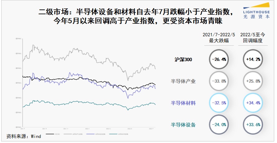 在二级市场,从 A 股2022年5月以来的回调幅度看,半导体材料和设备行业的涨幅分别达到34.4%和33.6%,为沪深300指数涨幅的二倍以上,也高于同期半导体产业指数涨幅,可见二级市场资金更偏好这两个细分领域的上市公司。
