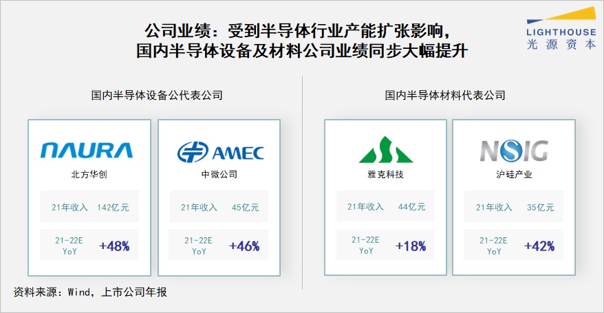 从上市公司业绩看,半导体设备材料企业在经济下行压力较大的背景下仍实现强势增长。其中,设备企业北方华创、中微公司2022年预计营收均超过45%;材料企业雅克科技预计营收增长18%,沪硅产业则预计增长42%。