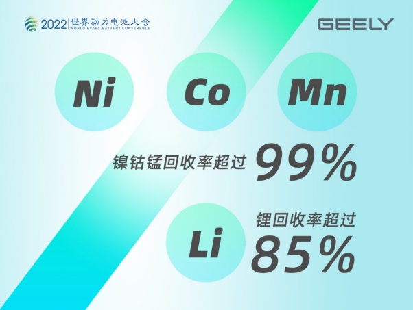 李书福认为,应该健全动力电池回收利用体系,提高资源循环利用效率。2018年,吉利科技集团携手合作伙伴布局电池回收、前驱体制造领域,已经形成了退役电池再生利用核心技术,建成了拆解破碎生产线和资源化再生利用生产线,在成本、效率上具有独特优势,其中镍钴锰回收率超过99%,锂回收率超过85%,达到行业先进水平。