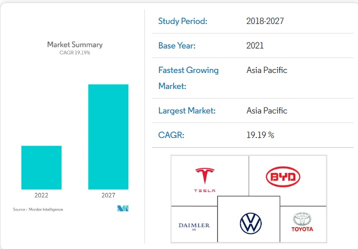 Mordor Intelligence公布的预测数据显示,该机构预计电动汽车市场规模在2027年将达到13933.3亿美元,CAGR高达19.19%。与Next Move统计标的有所不同,Mordor Intelligence统计的电动汽车标的包含电池电动汽车、插电式电动汽车、燃料电池电动汽车和混合动力电动汽车类别。