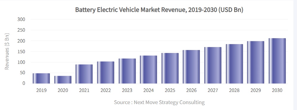 根据市场调研机构Next Move Strategy Consulting公布的统计与预测数据,预计到2030年电池电动汽车市场规模将达到2121.6亿美元,2020-2030年复合增速(CAGR)约为14%。
