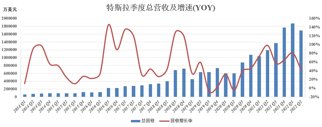 同时,特斯拉已连续六个季度营收超100亿美元大关。总营收较去年一季度同比增长42%,但较Q1明显下降,如前所述,交付量、总营收环比下滑及增速放缓反映出在高通胀率、供应链难题以及新冠疫情等重压之下,特斯拉不得不放慢增长的脚步,也不排除美元汇率上行带来的负面影响。