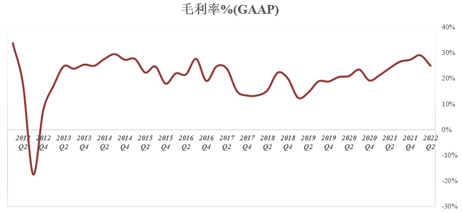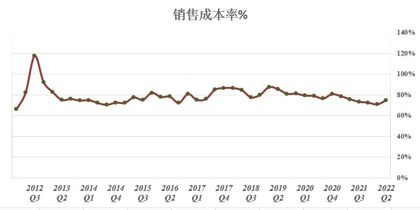 从销售成本率走势图能看出特斯拉近几年在成本端下足了功夫,坚持花较少的支出创造最大的价值,近几年努力将该指标控制在70%-80%区间。特斯拉第二季度销售成本率约为74%,高于上季度,但略低于去年同期水平。在第二季度通胀率刺激劳动力成本与原材料高企以及供应链受阻的背景之下,在控制销售成本方面,特斯拉第二季度可以说是“相当节俭”。