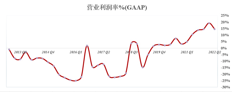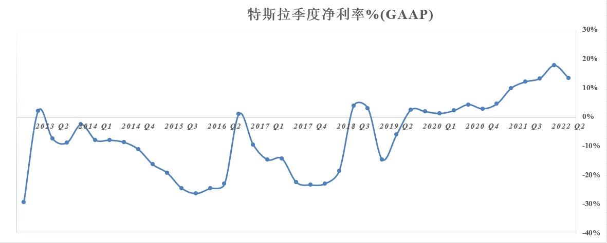 特斯拉第二季度GAAP准则下净利润为22.59亿美元超市场预期,同比增幅达98%。在净利润强劲增长的带动之下,特斯拉Q1净利率仍然处于较高水平,达到13%。该指标自实现“上岸”(即高于0)以来持续上升,近几个季度均处于高点附近,但第二季度在通胀及供应链等重压下难以再创新高。