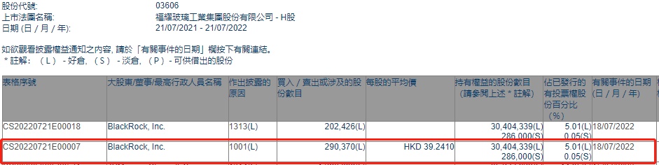 智通财经APP获悉,香港联交所最新资料显示,7月18日,贝莱德增持福耀玻璃(03606)29.0370万股,每股作价39.2410港元,总金额约为1139.44万港元。增持后最新持股数目约为3040.43万股,最新持股比例为5.01%。