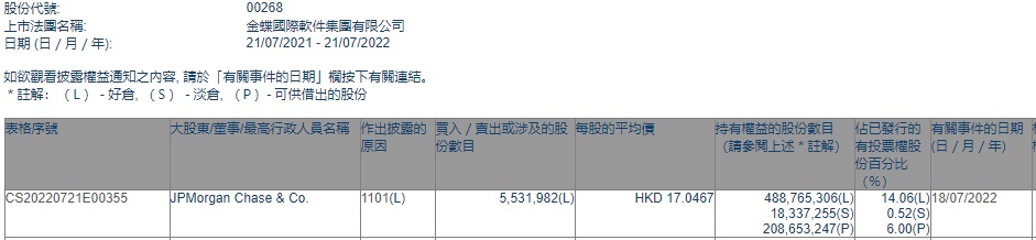 智通财经APP获悉,香港联交所最新资料显示,7月18日,小摩增持金蝶国际(00268)553.1982万股,每股作价17.0467港元,总金额约为9430.20万港元。增持后最新持股数目约为4.89亿股,最新持股比例为14.06%。