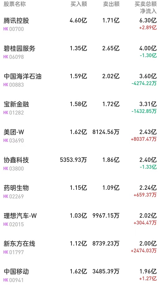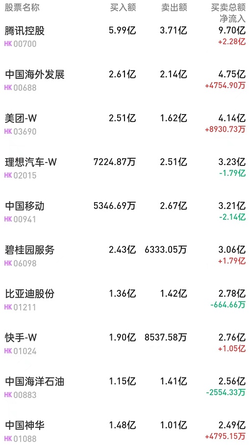 此外,中国神华(01088)、中国海外发展(00688)分别获净买入4795万、4754万港元。而中国移动(00941)、中海油(00883)分别遭净卖出8710万、6828万港元。