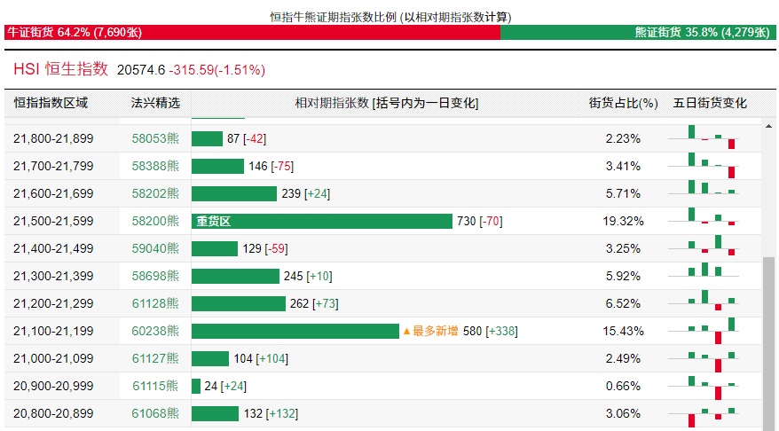法兴恒指牛熊证街货分布图中的数据显示,熊证街货重货区在21500-21599区间,该区间最新熊证数量为730张,较上一交易日减少70张;最多新增在21100-21199区间,该区间最新熊证数量为580张,较上一交易日增加338张。