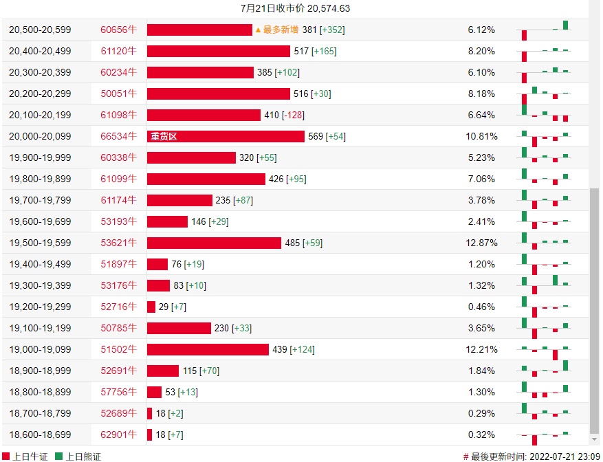 牛证街货重货区在20000-20099区间,该区间最新牛证数量为569张,较上一交易日增加54张;最多新增在20500-20599区间,该区间最新牛证数量为381张,较上一交易日增加352张。