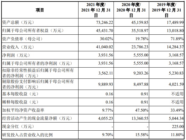 于2019年、2020年及2021年,公司分别实现营业收入约1.428亿元、2.379亿元和4.104亿元,净利润分别约为3168.57万元、5555.00万元和3931.56万元。