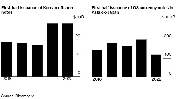 2022年上半年,韩国海外债券的发行规模为287亿美元,略低于去年上半年的纪录。SG Lee预计,今年下半年的发行规模将与2021年同期的160亿美元持平。