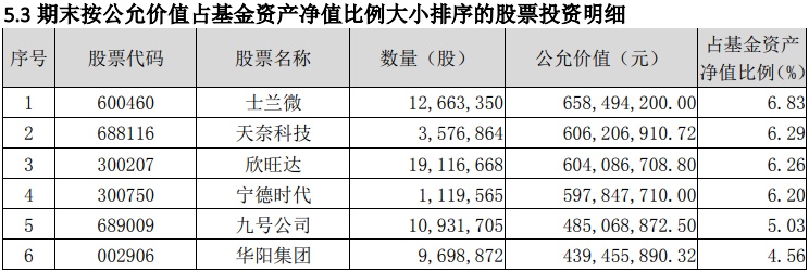 相较于一季度,天赐材料、星源材质新晋前十大重仓股行列,二季度,该基金增持士兰微、欣旺达、九号公司、华阳集团、闻泰科技,减持宁德时代,维持天奈科技、紫金矿业持仓不变。