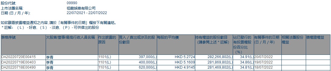 智通财经APP获悉,香港联交所最新资料显示,7月18日至20日,执行董事兼CEO李青分别增持祖龙娱乐(09990)62万、40万、39.7万股,每股作价分别为4.9145港元、5.1609港元、5.2724港元,总金额约为720.45万港元。增持后最新持股数目约为2.82亿股,最新持股比例为34.91%。