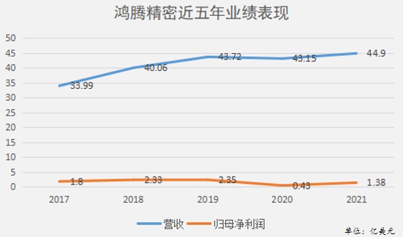 业绩来看,2017-2021年鸿腾精密实现营收33.99亿美元、40.06亿美元、43.72亿美元、43.15亿美元、44.9亿美元,归母净利润1.8亿美元、2.33亿美元、2.35亿美元、0.43亿美元、1.38亿美元,呈现出较大波动性。