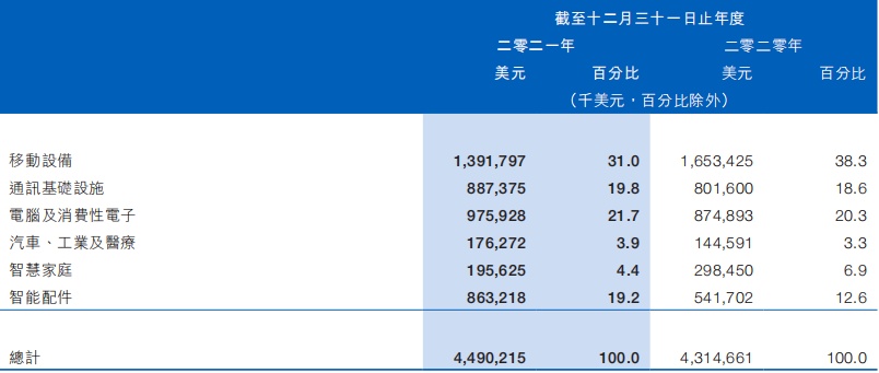 同期,通讯基础设施、电脑及消费性电子、智能配件分别实现收入8.87亿美元、9.76亿美元、8.63亿美元,占比19.8%、21.7%、19.2%。相比之下,智慧家庭以及汽车、工业及医疗两块业务的规模仍较小,2021年分别实现收入1.96亿美元、1.76亿美元,占比仅为4.4%、3.9%。