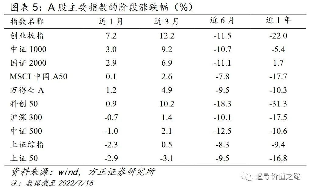 截至2022年7月16日,创业板市盈率75分位数除以25分位数的比值为2.44倍,内部估值分化程度位于2010年至今74%的历史分位数水平。可以看到自2021年春节后开始,创业板的估值分化水平出现显著下降,当前这一比值大约处在近三年低点。这意味着板块内部的行情正在从大幅溢价的大盘股向长期低迷的小盘股持续扩散。