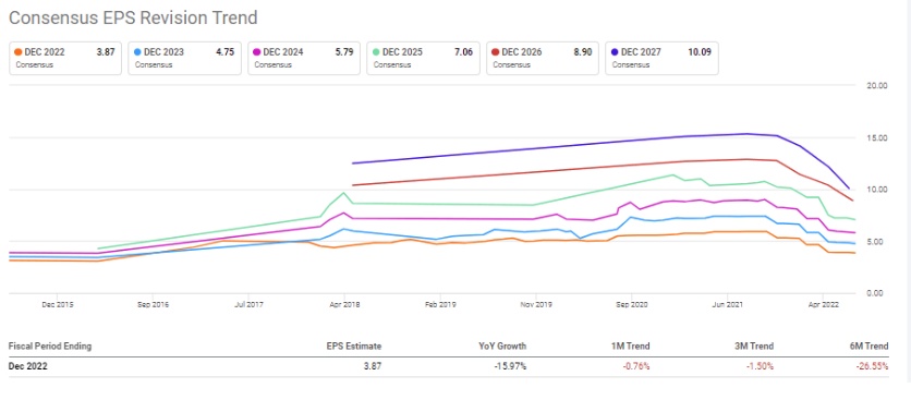 分析师已开始削减对金融科技股的每股收益预期。如下图所示,PayPal(PYPL.US)在过去三个月里,分析师对其2022年的每股收益预期共计下调47次,没有上调。与此同时,更传统的金融支付股万事达卡2022年每股收益预期仅被下调2次,而同期有15次上调。Chiodo看好万事达卡和维萨卡(V.US)的原因是其均衡的风险敞口、抗衰退的增长算法,以及减少随意营销支出的能力。