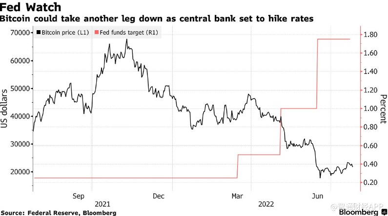 智通财经APP获悉,美联储加息前的恐慌让比特币跌回1.9万-2.2万美元交易区间。周一,这一最大的数字代币下跌4.3%,交易价格为21820美元。第二大数字代币以太坊以及Avalanche和Solana等较小的虚拟货币出现了较大的跌幅。