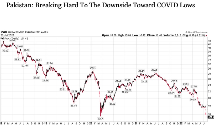 从现在到2022年底,另一个潜在的市场不稳定事件是,新兴市场许多主权借款人不断恶化的金融状况可能演变成一场全面危机,蔓延至全球发达市场,就像我们在上世纪90年代末看到的那样。有几个国家已经违约,包括最近的斯里兰卡,其他几个国家也面临着很高的违约风险,包括乌克兰、埃塞俄比亚、萨尔瓦多和加纳。但目前最值得密切关注的两个国家是巴基斯坦和埃及,它们对金融市场有着更广泛影响。对于这两个国家,它们的信用违约互换(CDS)在7月份都大幅超出了本已很高的水平。此外,两国的股市表明,未来可能会有更多的困难,因为两国目前都在重新测试新冠疫情时的低点,并似乎准备最终突破后继续下行。