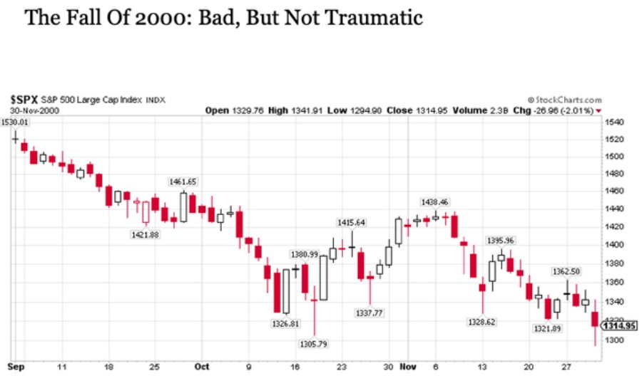 股市是会保持坚挺还是会进一步下跌,仍有待观察。如果有什么不同的话,Parnell表示,他可能会预期股市在今年的下跌中会出现更有节制的调整,就像在2000年秋天经历的那样,当时科技股泡沫还处于破灭的早期阶段。
