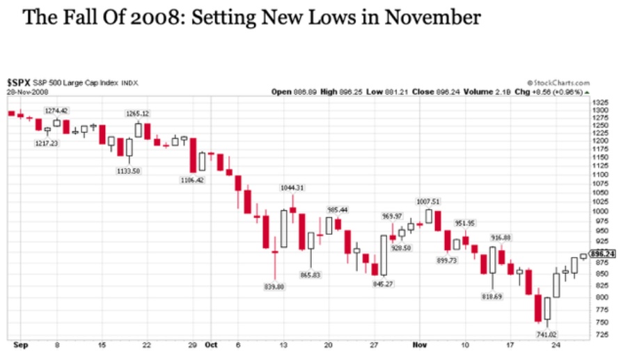 最后,11月的威胁也不应忽视,虽然从历史上看,它往往是一个积极的月份,因为股市一般会开始从此上升到12月,而12月是一年中平均最好的月份之一。但当股市跌势恶化时,跌势往往会延续到11月的头两周,甚至更长时间。下面的图表显示了这种情况在2008年秋天(创新低)和1987年秋天(创新低)是如何发生的。
